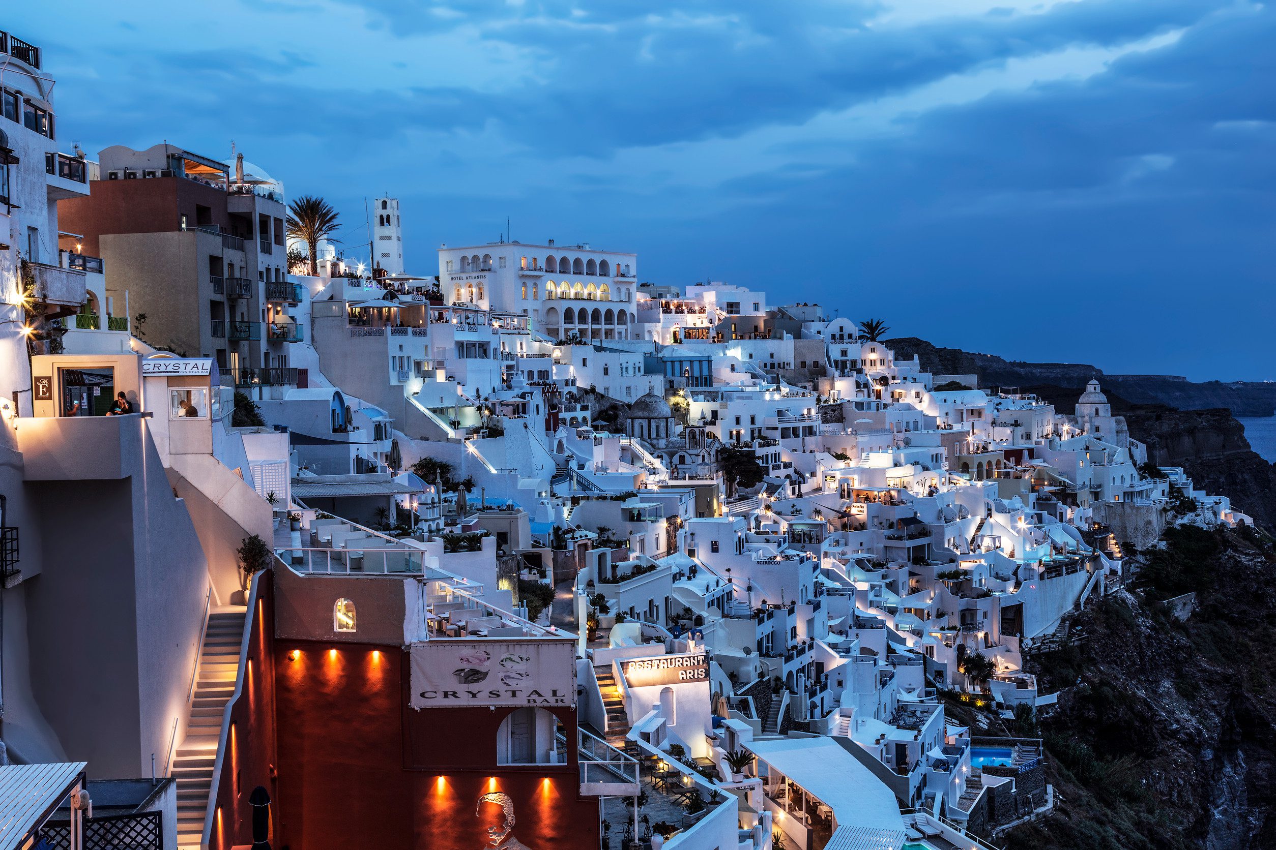 聖托里尼的市中心,街道蜿蜒,滿佈白牆藍頂建築與特色商店,融合傳統與現代氣息。這裡的日落景色迷人,是欣賞火山與海景的絕佳地點。費拉也是交通中心,許多旅客以此為據點探索全島。